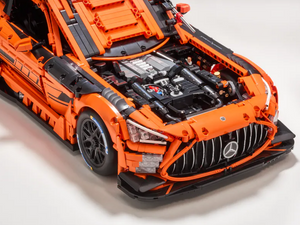 Ein Rennwagen, wie gemacht für den Langstrecken- und GT-Rennsport, der bereits bei herausragenden Rennen wie dem 24h-Rennen am Nürburgring oder dem 24h Rennen in Spa-Francorchamps glänzte: Mit dem Mercedes-AMG GT3 Klemmbaustein Modell holen Sie sich das Rennsport-Feeling auch in die eigenen vier Wände. Zusammengesetzt aus 5.466 Einzelteilen, begeistert das Modell durch eine Vielzahl an Funktionen, etwa durch ein 8-Gang-6-Gang-Getriebe mit Druckknopfschaltung und Ganganzeige, ein verstellbares Lenkrad vorne und hinten sowie eine funktionale Lenkstange mit fahrsynchronem Motorbetrieb. Eine Einzelradaufhängung, abschließbare Türen für noch mehr Realismus und ein modulares Schnellverschluss-Design für Motorhaube, Motor, Ansaugsystem und Mittelkonsole machen das Klemmbaustein Modell perfekt. Für die passende Beleuchtung sorgen wiederum LED-Scheinwerfer und Heckleuchten. Geliefert wird das Modellauto in der original CaDA Masters Hersteller-Verpackung und eignet sich so auch ideal als Geschenk für begeisterte Rennsport-Fans.