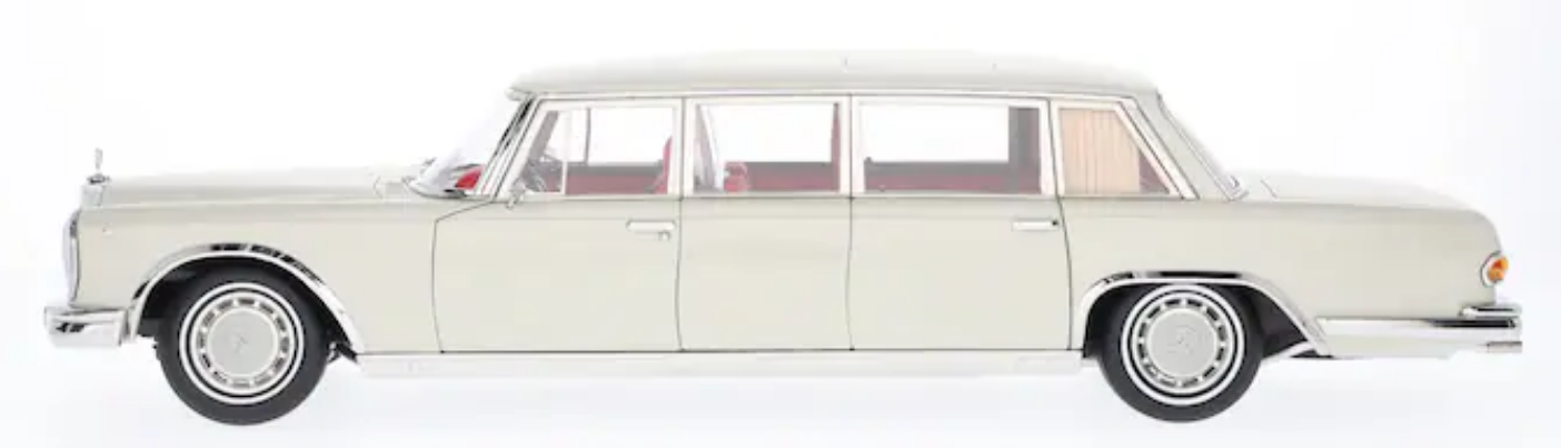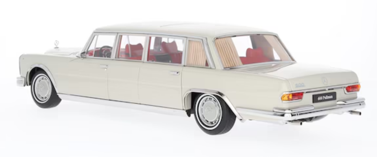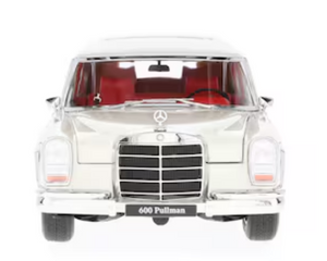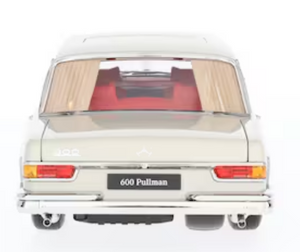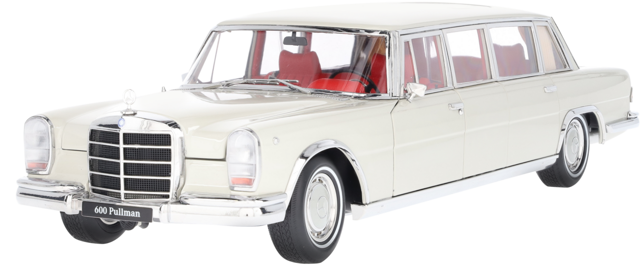 There are models that cause a stir in the automotive industry and leave a lasting impression even decades later. This certainly includes the Type 600, which rolled off the production line between 1963 and 1991 and caused a real sensation when it was presented at the Frankfurt Motor Show in September 1963. After all, the saloon was designed as an exclusive representative vehicle and, as a new top-of-the-range model, was equipped as standard with unique technical features in line with the state of the art at the time. For the first time, a V8 injection engine with a displacement of 6.3 liters and a maximum output of 250 hp was used to power the car. Together with the built-in automatic gearbox, this made it possible to achieve sports car-like speeds of over 205 km/h. Series production of the "Big Mercedes", as the Type 600 was also known, finally began in September 1964 and included other variants in addition to the five- to six-seater saloon. And even as a miniature model on a scale of 1:18, the 600 Pullman saloon W 100 still makes collectors' hearts beat faster today. After all, the hand-assembled precision model consists of over 378 individual parts and 157 prints and decorations and is painted in an authentic color. You can also look forward to a faithful reproduction of all interior details, such as a high-quality decorated interior and a flocked interior and trunk floor. In addition, six parts of the model - doors, hood and tailgate - can be opened. In the trunk, you will also find six suitcases in different sizes. The spare wheel storage compartment in the trunk can also be opened. A steering axle and axle suspension complete the features of the model car, which is supplied in Mercedes-Benz Classic packaging. You will find a glove in the packaging so that you can remove the precision model from the packaging without leaving fingerprints on the glazing or the painted bodywork.