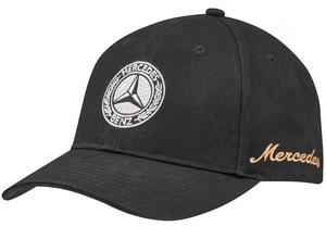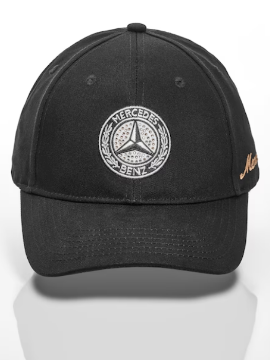 Diese Cap zieht Blicke auf sich. Im Farbton Schwarz und aus 100 % Baumwolle gearbeitet, verspricht die größenverstellbare Cap nicht nur besonders angenehmen Tragekomfort. Vor allem in puncto Design kann sie überzeugen. Neben einem goldfarbenen gestickten historischen „Mercedes“ Schriftzug hinten sticht vor allem der gestickte Classic Stern mit Kristallen auf der Stirnseite hervor.