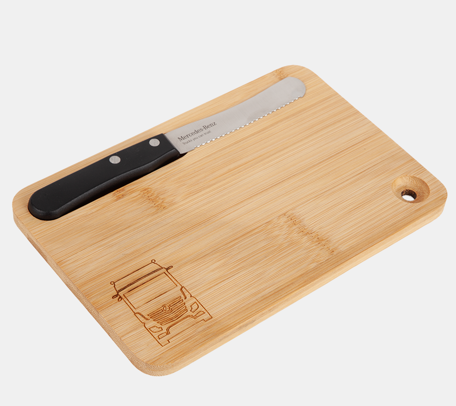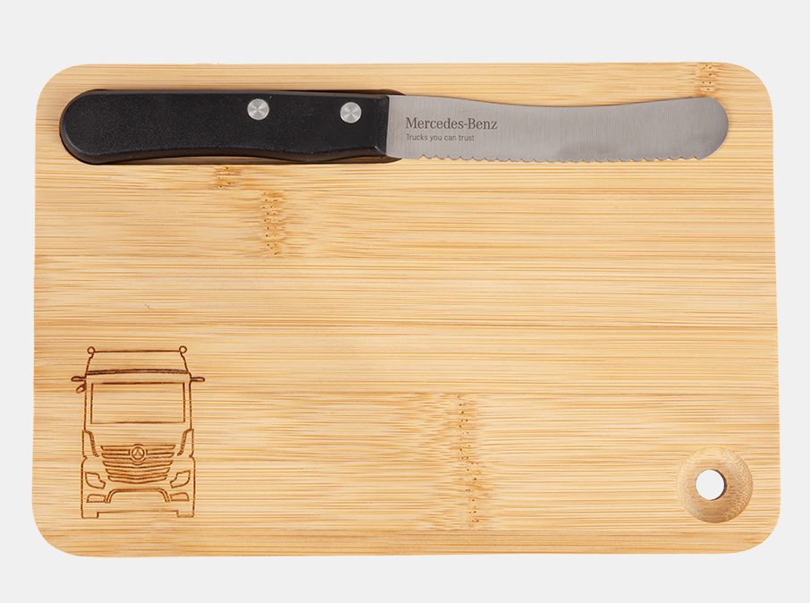 Ce set à découper et à manger combine un couteau à petit-déjeuner tranchant et de haute qualité avec un tranchant ondulé et une planche à découper pratique en bois. Parfait pour couper des fruits ou des snacks au petit-déjeuner ou au déjeuner. Avec le pictogramme Actros en bas à gauche de la planche à découper et la marque verbale Mercedes-Benz Trucks gravée le long du couteau.
