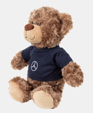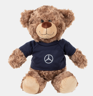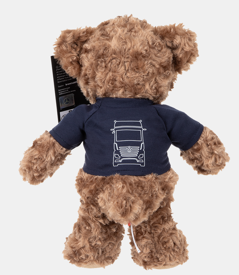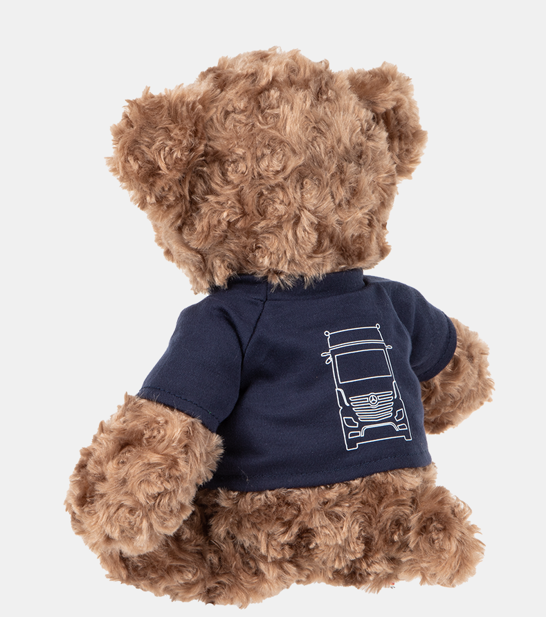 Un adorabile orsetto di peluche con un sorriso amichevole, occhietti fedeli e una maglietta Mercedes-Benz Trucks, completa di logo e grafica del camion.