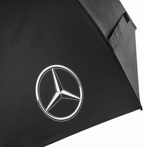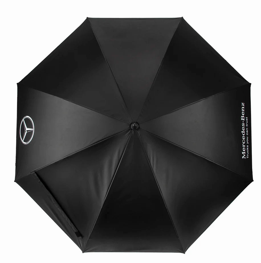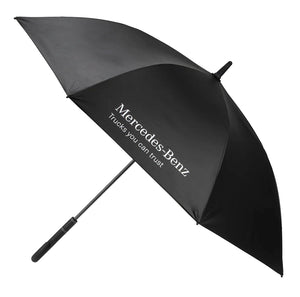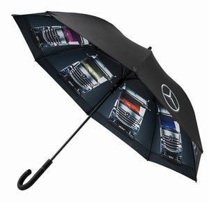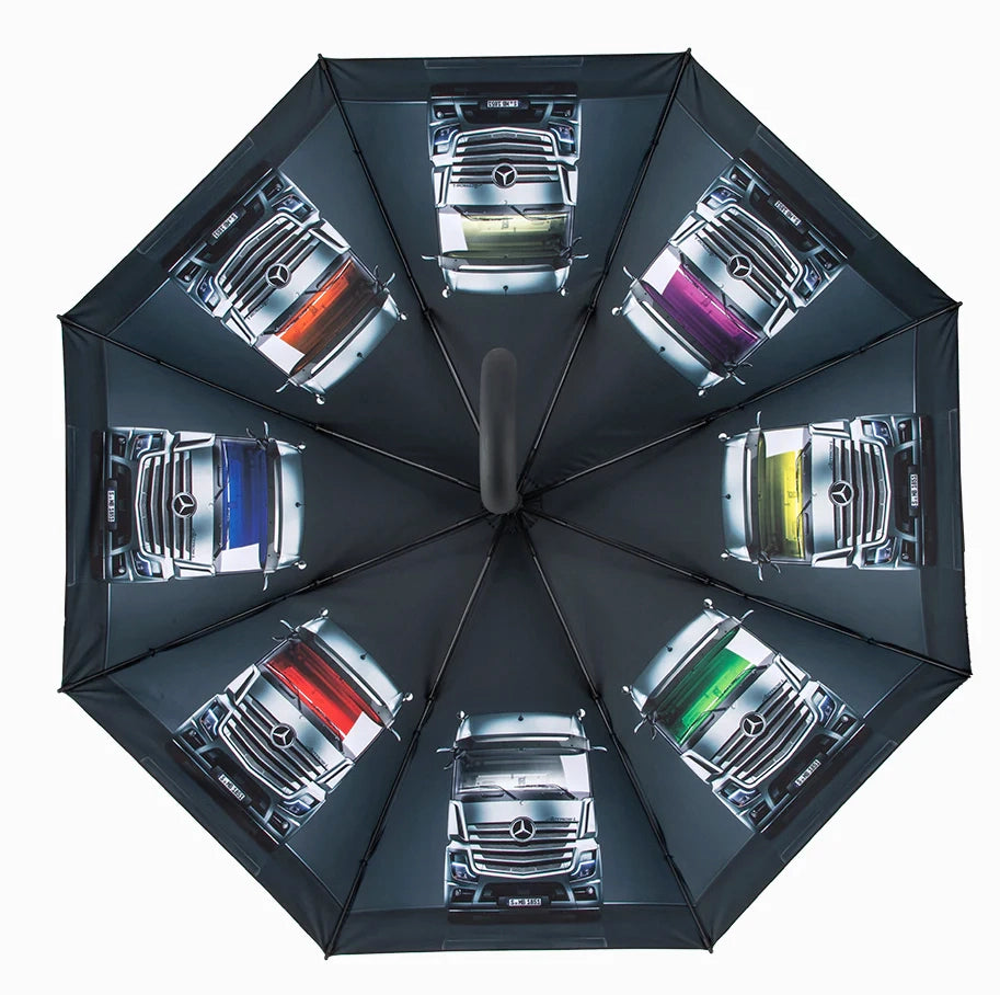 Ombrello classico con una grande illustrazione a camion su tutti gli 8 segmenti interni e una pratica funzione automatica per un'apertura rapida. È dotato di nervature flessibili in fibra di vetro e di un sistema antivento di alta qualità per la massima flessibilità della struttura in caso di vento forte. Personalizzato con il logo Mercedes-Benz Trucks su due segmenti esterni.