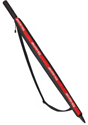 Schlägt das Wetter einmal um und dicke Tropfen bahnen sich ihren Weg zur Erde, bietet der schwarz-rote Gästeschirm idealen Schutz. Doch nicht nur die Funktionalität des Schirms überzeugt auf ganzer Linie, auch die Optik lässt kein Wünsche offen. So erscheint der Stock in mattem Schwarz, während Schienen und Schirmspitzen in Rot gehalten sind. Schwarze Scharniere, ein schwarzes Futteral mit dekorativem AMG Logo Brand in Rot mit gedrucktem weißem AMG Logo Band sowie ein schwarzer Schulterriemen runden das Design des Gästeschirms gekonnt ab. Mit seinem ergonomisch geformten Griff mit Soft-Feel-Beschichtung und feinem, perforiertem Lederbezug greift der Schirm das Design des Mercedes-AMG GT auf, während die silberfarbene Auslösetaste mit AMG Rauten ein schnelles, automatisches Öffnen ermöglicht.